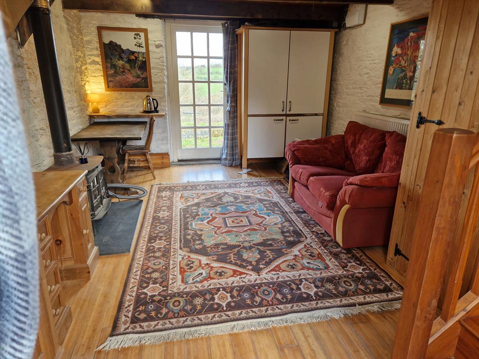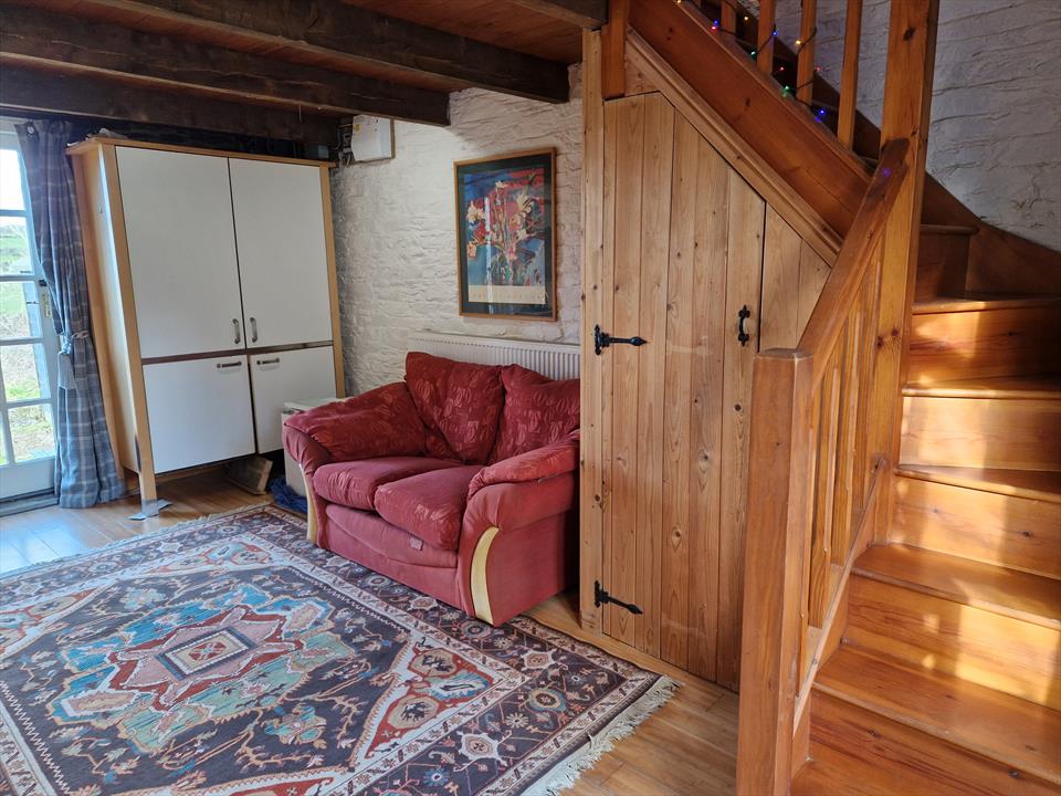 It has a wood burner, IKEA fully appointed kitchen-in-a-cupboard, (sink, hob, fridge, worktop.drainer, drawers and cupboards), This can be fully closed up. General living space has a comfy 2 seat sofa (option of king size sofabed) small dining table and chairs (seats 2 or pulled out seats 4). Macerating understair toilet (small space for this), no shower, but use of easy access, close by, large shower room in house. Wooden stairs to mezzanine sleeping platform with pitched roof and kingsized double bed and chest of drawers and bedside tables.