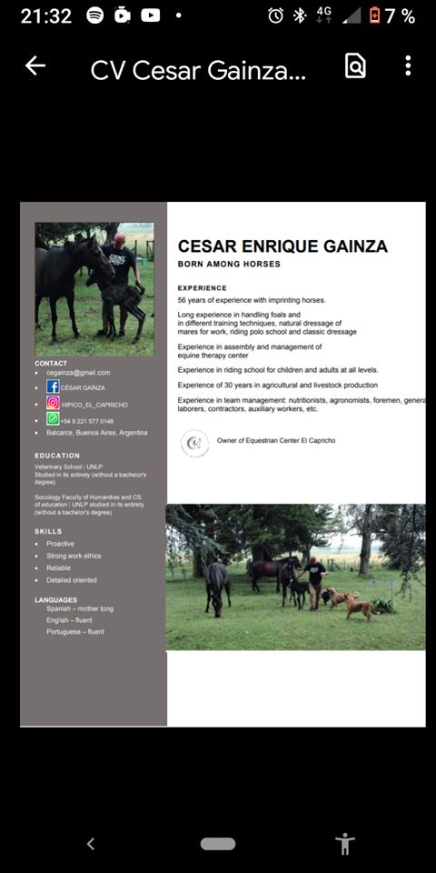 Domador natural de caballos. IMPRITING. Y doma clásica. Equinoterapia. Clases para niños y adultos todos los niveles. Manejo de grupos de trabajo.