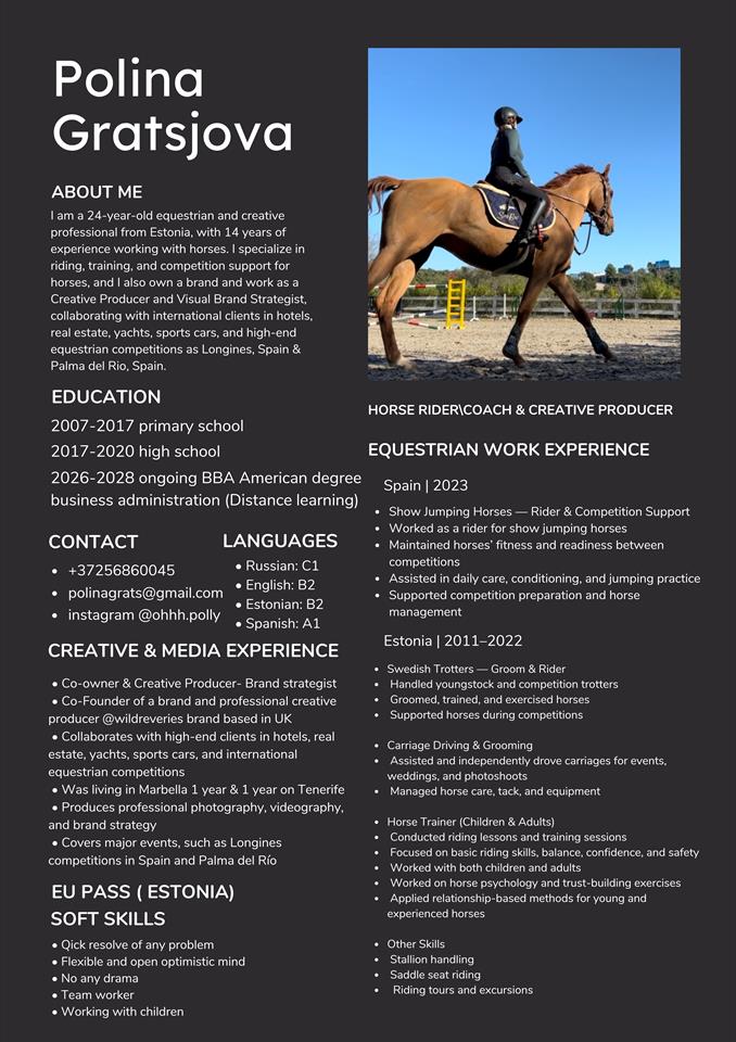 Rider & trainer for show jumping horses (Spain 2023), groom & rider for Swedish trotters, carriage driver, and instructor for children & adults (Estonia). Experience in horse care, training, and competition support.